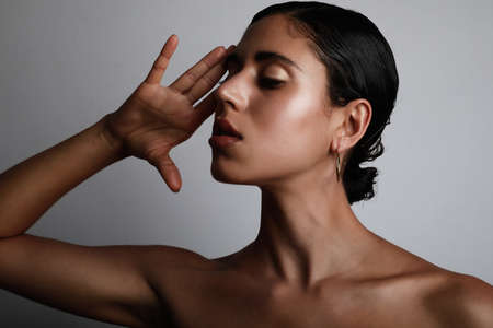 Fashion and beauty concept, Fashion woman with glowing makeup and pose on gray background.