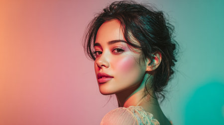 A young woman poses confidently, showcasing her soft makeup and creative hairstyle. The colorful backdrop enhances the artistic feel of the moment captured in a stylish environment.