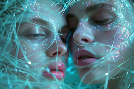 Dive into the ethereal dreamscape with this captivating image of two faces adorned with shimmering details and a tranquil blue hue, perfect for artistic exploration