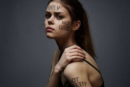 Emotional woman with inscriptions on body upset with frustration gray background