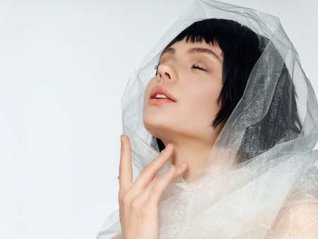 a woman with dark hair and closed eyes raised her head up and a transparent cloth