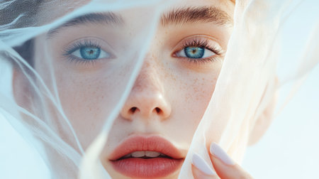 Close-up portrait of a young woman with striking blue eyes and delicate features behind a sheer veil