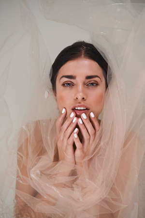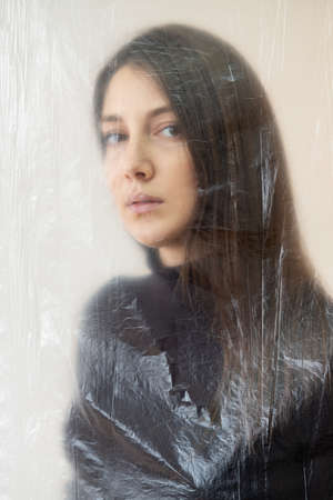 Young beauty sad woman trapped behind a plastic sheet as protection against COVID-19. Nicely fits for book cover