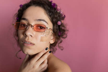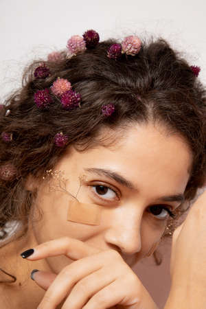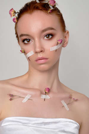 beauty portrait of a girl with flowers glued on a plaster to the body and face