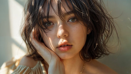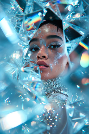 This stunning close-up portrait features a young woman with luminous skin and sparkling accessories, embodying beauty and grace in soft natural light, perfect for artistic projects.