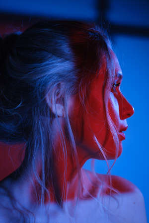 Female health and beauty. Art portrait of a beautiful tender girl with light natural makeup in mixed blue and crimson lighting. Studio portrait. Copy space.