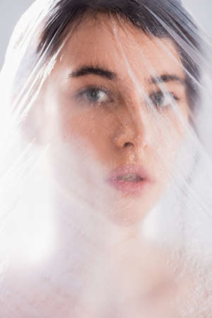 brunette woman covered with polyethylene looking at camera isolated on gray, ecology concept