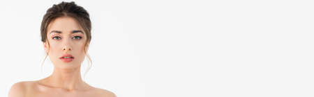 young woman with naked shoulders looking at camera isolated on white, banner