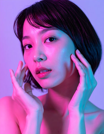 Portrait of beautiful asian woman looking at camera in neon light