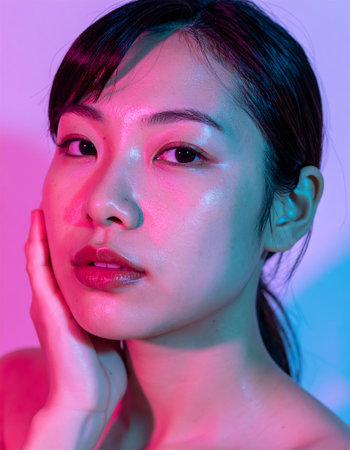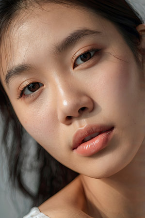 A close up of a beautiful young Asian woman's face, highlighting her radiant skin and gentle expression This image is perfect for beauty, skincare, and cosmetic promotions.