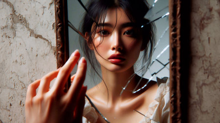 Reflective encounter in broken glass showcasing a thoughtful expression under natural light