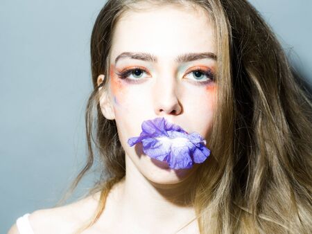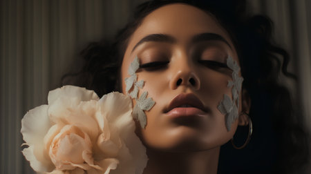 Tender woman with healthy skin and flowers on face
