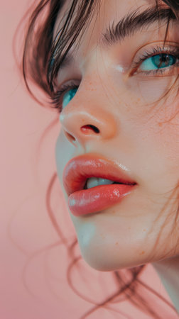 Close-up of a woman's face with glossy lips and clear skin, highlighting skincare and lip augmentation.