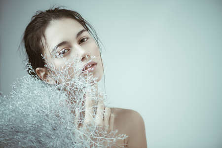 Beauty portrait. Sensual brunette girl with a white snowy plant. Winter look. Cosmetics, make-up. Perfumery.