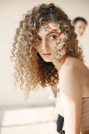 Young girl with pretty face and bright orange floral makeup with flower petals on head in studio on grey background