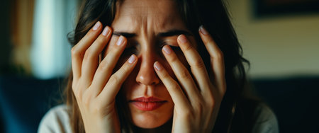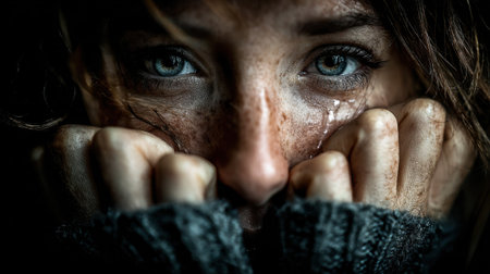A woman sits with her hands on her face, revealing deep emotional turmoil. Her tear-streaked cheeks and expressive eyes convey a profound sense of vulnerability in a softly lit environment.