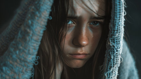 Emotional portrait of a girl under a shawl in soft lighting, conveying deep feelings and solitude