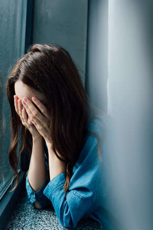 Portrait of young attractive caucasian woman suffering from depression, stress and anxiety. Sad and lonely woman crying, feeling depressed, distressed, worried and overwhelmed. Mental Health care.