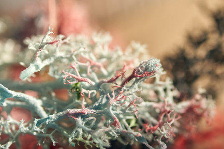 Macro shot of colorful lichen on branches in natural sunlight with soft focus background.