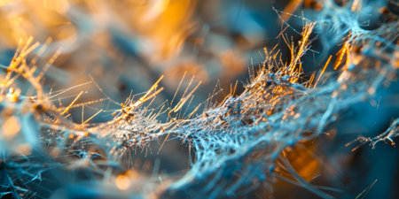 Ethereal Blue and Gold Cobweb Close-Up: Artistic Macro Photography.