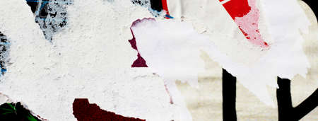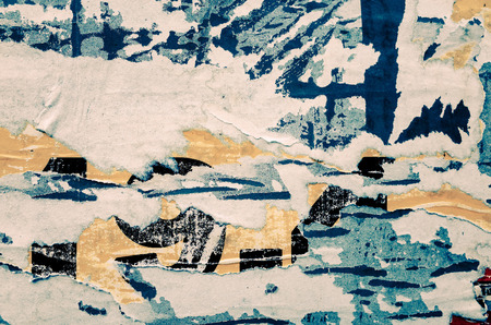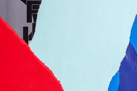 Old grunge ripped torn collage posters creased crumpled paper placard texture background with red, yellow, white, blue colors