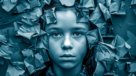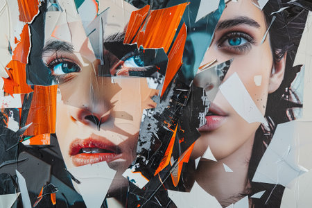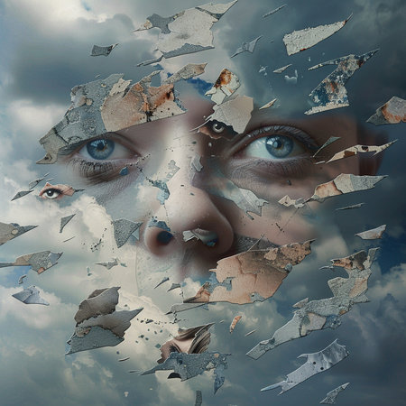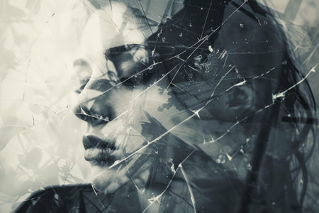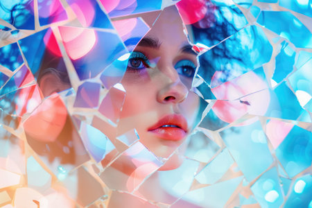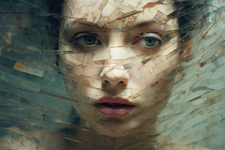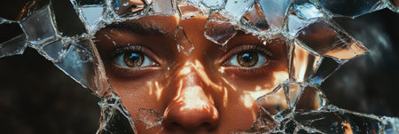 Shattered glass reflects a fragmented and expressive face highlighting emotions and intricate details of a gaze. Generative AI