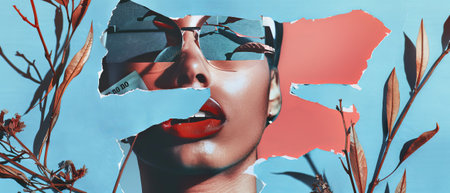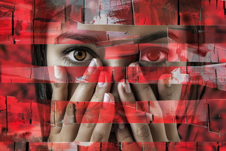 Emotional and complex artistic photo collage of a womans face with abstract red fragments