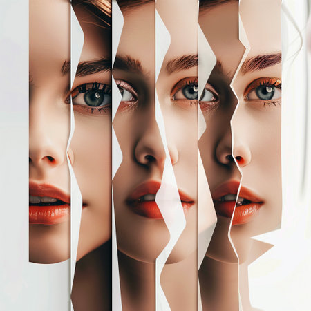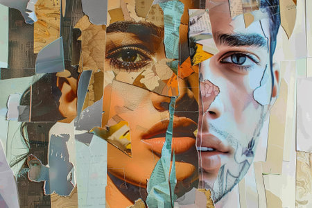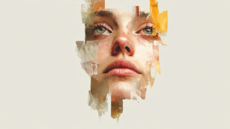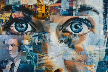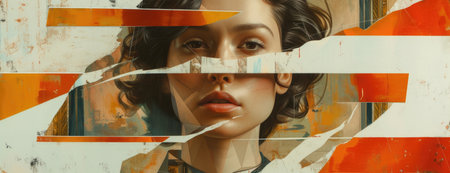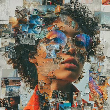A creative portrait blending art and digital imagery, capturing emotions and stories within a fragmented visual narrative.