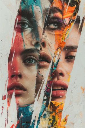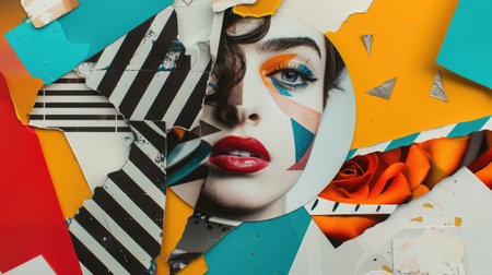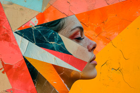 A contemporary digital art piece depicting a fragmented portrait with vibrant colors and geometric patterns on a creative backdrop