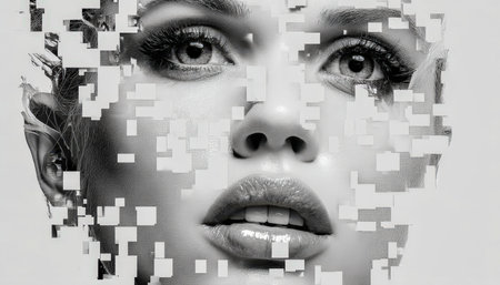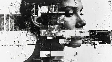 A high-contrast black-and-white digital artwork featuring a woman's face fragmented by abstract glitch effects, conveying a modern, edgy mood.