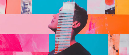 Minimalistic mixed media collage showcasing vibrant textures and urban lifestyle elements