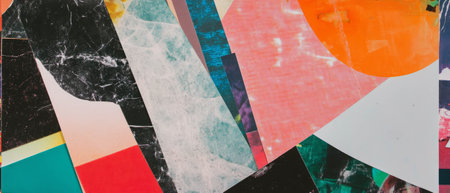 Creative minimalistic scrapbook collage with textured surfaces and vibrant cutouts