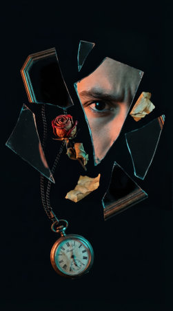Man eye reflected in shattered glass alongside a dried rose and an antique pocket watch on a dark background conveying mystery and introspection. Ample negative space around the composition provides room for text and design