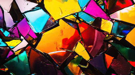 Abstract background of cracked glass texture with vibrant shards and patterns