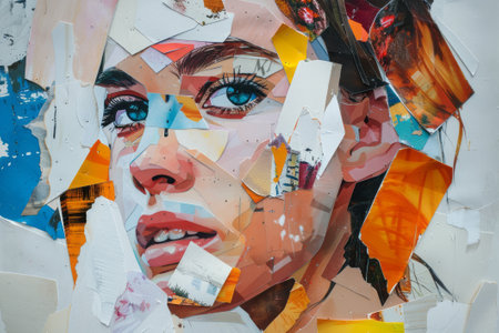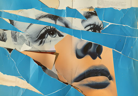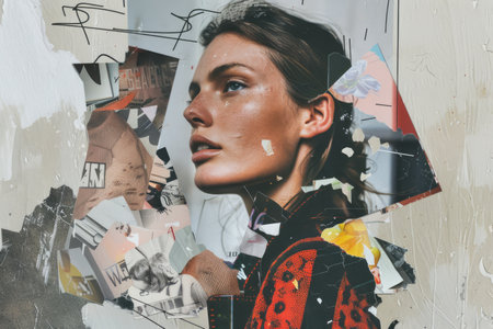 A woman gazes thoughtfully while her profile is framed by an artistic collage of torn paper and paint, reflecting creativity and depth in an urban art setting.