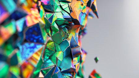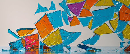This vibrant abstract image features fragmented glass pieces in geometric shapes. The colorful gradient background enhances the modern artistic design, creating a striking visual.