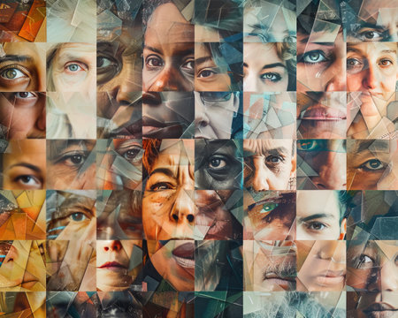 Mosaic of human faces displaying diverse emotions reflecting emotional intelligence and complexity