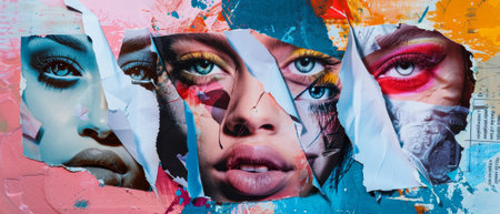A collage of two women's faces with one of them having a nose piercing. The collage is made up of different pieces of paper and has a bold, edgy feel to it