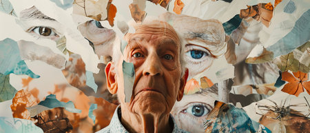 A man's face is made up of paper cutouts. The image is a collage of different shapes and sizes, creating a unique and abstract representation of the face. Scene is somewhat chaotic and disordered