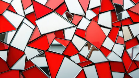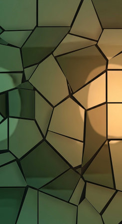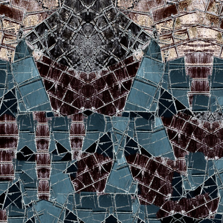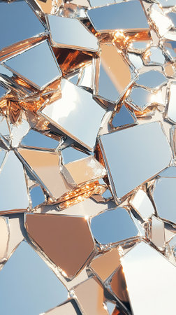 A close-up view of a textured surface featuring broken and cracked mirrors, reflecting light and various shades. The intricate patterns create a visually appealing abstract design.