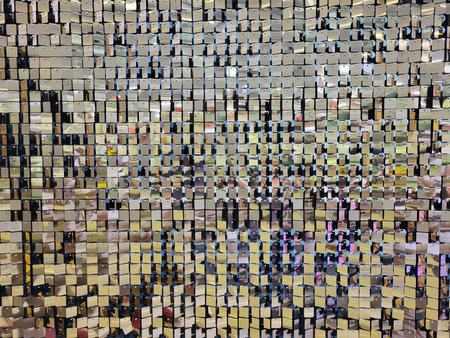 A metal wall made of many triangles. Triangles with sharp corners and gradient transitions.