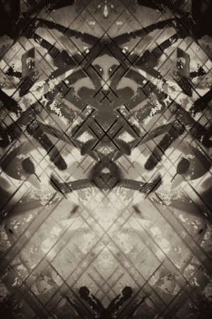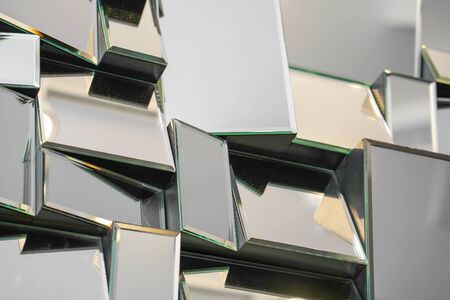 Mirror with foursquare in wall, decoration and reflection. Abstract glass background. Polygonal surface. Closeup. Texture.