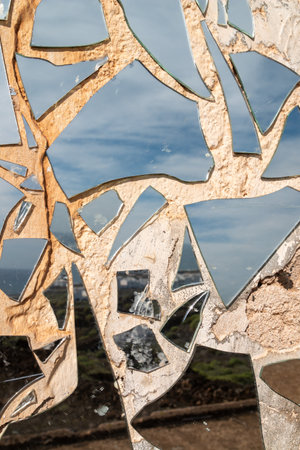 Abandoned simple building. Outer wall covered by graffiti and a mosaic made of pieces of mirror. Lanzarote, Canary Islands, Spain.