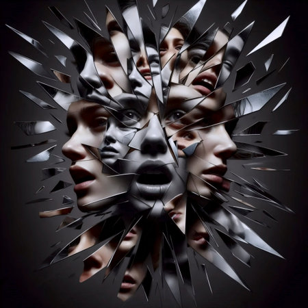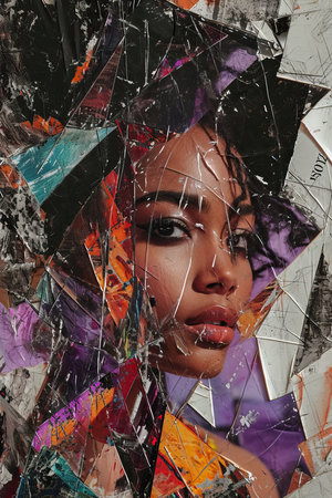 Reflection of broken dreams with shattered mirrors revealing hidden emotions and thoughts of a young woman