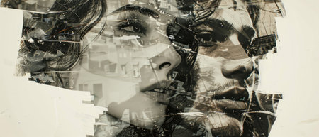 A collage of two women's faces with one of them having a nose piercing. The collage is made up of different pieces of paper and has a bold, edgy feel to it