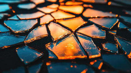 Cracked and shattered glass with metallic shards, reflecting a fiery sunset. Generative AI