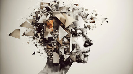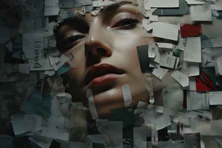 Young woman with face pieces detached, symbolizing prosopagnosia or face blindness diagnosis, portraying distorted memory and identity.