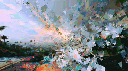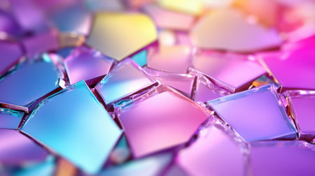 This vibrant abstract image features fragmented glass pieces in geometric shapes. The colorful gradient background enhances the modern artistic design, creating a striking visual.
