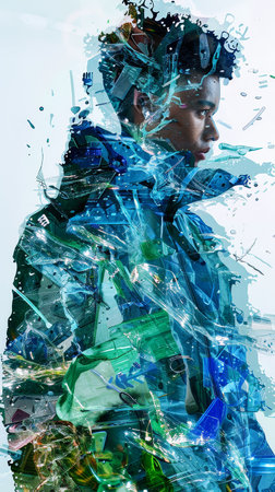 Abstract digital art of young Asian male with glitch effect and fragmented layers.