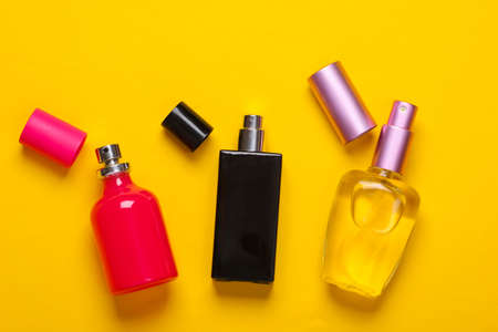 Perfume bottles on a yellow background. Top view